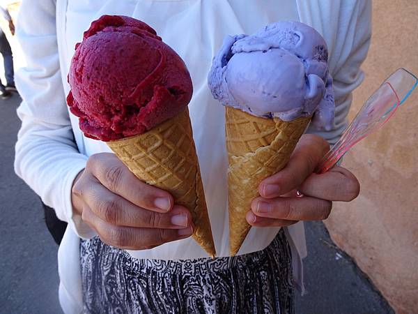 我在這裡吃薰衣草冰淇淋,我妹點莓類的冰淇淋,每枝5歐(台幣177元)