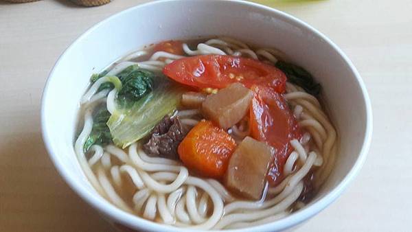 早上起床後,我們先拿蔬菜跟番茄煮了紅燒牛肉麵